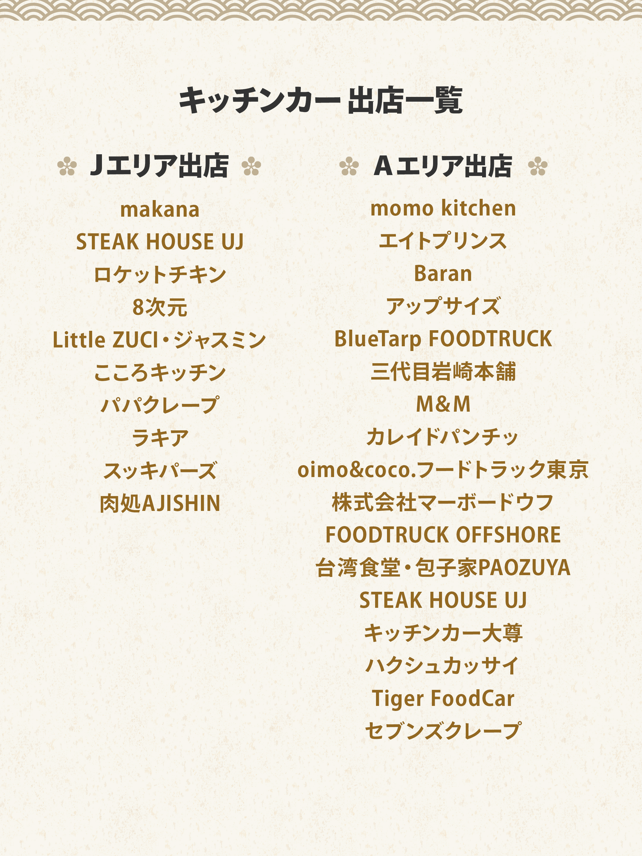 本イベントでは、AエリアとJエリアの2か所にキッチンカーが大集合!Jエリアには10店舗、Aエリアには17店舗、合計27店舗が個性豊かな自慢の味をお届けします。普段は出会えないバラエティに富んだお店が一堂に会し、ここだけの特別なグルメ体験が待っています。