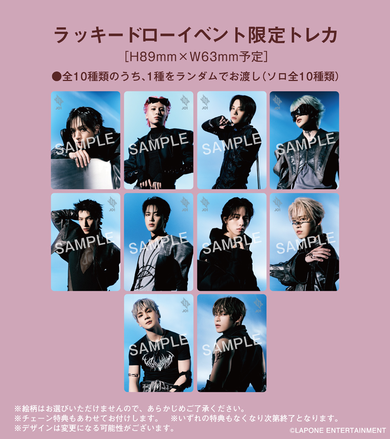 期間中に、対象店舗にて、JO1 10TH SINGLE『Handz In My Pocket』(初回限定盤A/初回限定盤B/通常盤)を3形態セットご購入いただいた方に、先着特典として“ラッキードローイベントCDショップ限定トレカ” (ランダム/ソロ全10種)をご購入いただいたセット分プレゼントいたします。
