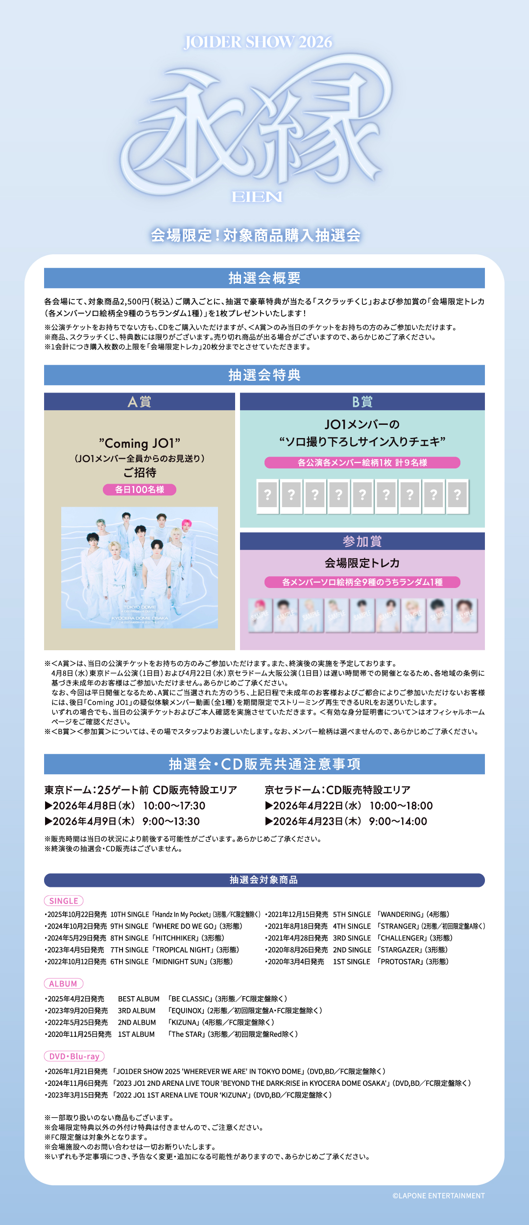 JO1ドーム公演「JO1DER SHOW 2026 'EIEN 永縁'」各会場のCD販売ブースにて、対象商品ご購入者向け抽選会の開催が決定しました!